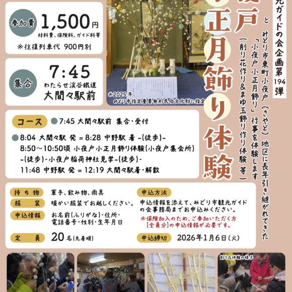 みどり市東町小夜戸地区に、長年引き継がれてきた「小夜戸小正月飾り」行事を体験します。削り花作りやまゆ玉飾り作りを体験できる、年に一度の特別なツアーです。