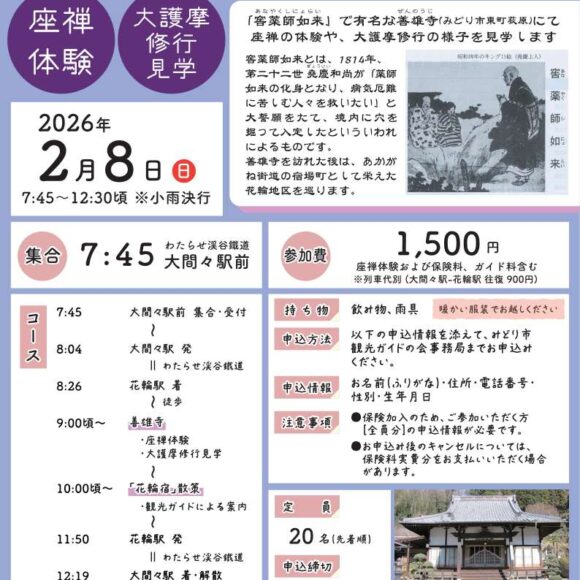 「窖薬師如来」で有名な善雄寺(みどり市東町荻原)にて 座禅の体験や、大護摩修行の様子を見学します窖薬師如来とは、1814年、第二十二世 堯慶和尚が「薬師如来の化身となり、病気厄難に苦しむ人々を救いたい」と大誓願をたて、境...