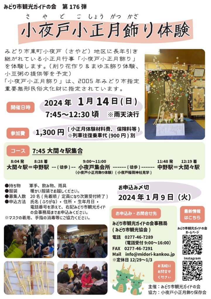 | 予約 | 【要】1月9日(火)〆切 ※氏名 ( ふりがな)・住所・生年月日・電話番号を添えて、下記みどり市観光ガイドの会事務局までお申込みください。 |