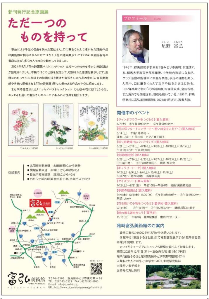 2024年9月、「花の詩画集ベストコレクション ただ一つのものを持って」(偕成社)が出版されました。本展ではこの出版を記念して、収録された原画を展示します。生涯にわたって500点以上の詩画を描き続けた富弘さんの作品の中から、富弘美術館や各地で開催される「花の詩画展」等で人気のある作品を中心に紹介します。