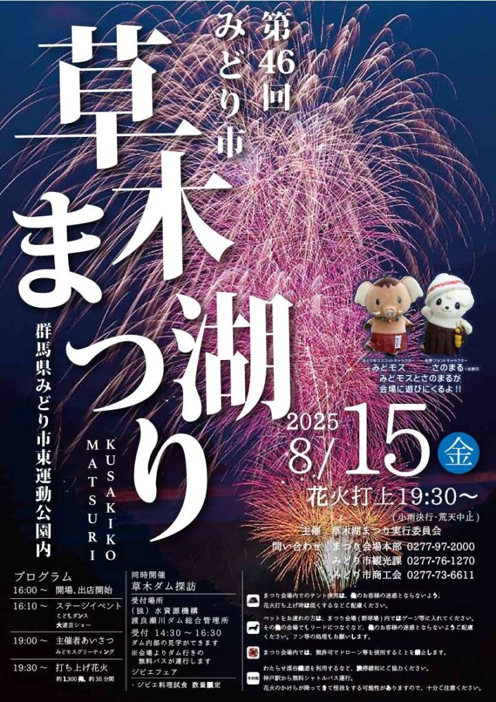 毎年8月15日に開催される「草木湖まつり」は、草木ダムの完成に伴い、この地域を離れた人に、年に一度は故郷で過ごして欲しい、との願いから始められました。