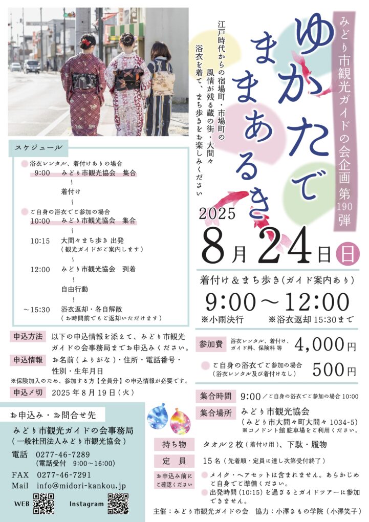 | 備考 | チラシ(PDF) ●募集人数:15名 (先着順・定員に達し次第受付終了) ●持ち物:タオル2枚(着付け用)、下駄・履物 【ご確認ください】 ・メイク・ヘアセットは含まれません。あらかじめご自身でご準備ください。 ・出発時間(10:15)を過ぎるとガイドツアーに参加できません。 ■みどり市観光ガイドの会事務局(みどり市観光協会内) 電話 0277-46-7289/FAX 0277-46-7291 メールアドレス info@midori-kankou.jp 電話受付時間 9:00~16:00 |