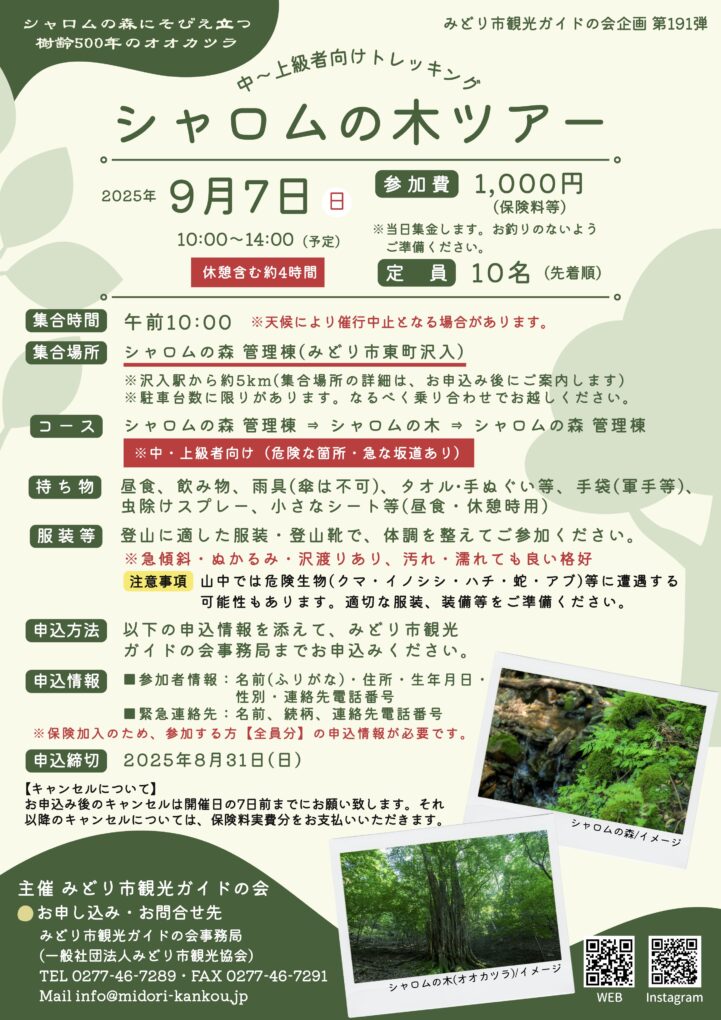 | 予約 | 【要】8月31日(日) 〆切 お名前(ふりがな)・住所・電話番号・生年月日・性別・緊急連絡先(お名前・続柄・連絡先電話番号)を添えて、みどり市観光ガイドの会事務局までお申込みください。 ※保険加入のため、参加する方全員分の申込情報が必要です。 |