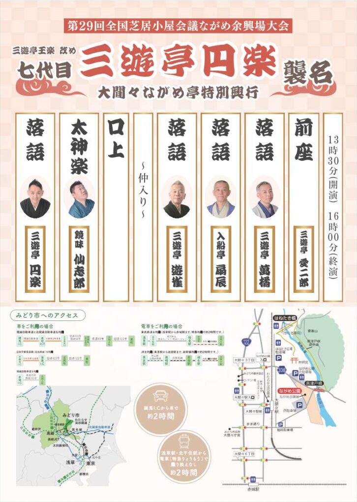 これまで、数多くの落語会の会場として親しまれ、多くの人々の笑いに包まれてきた、ながめ余興場において、全国芝居小屋会議の開催にあわせて「七代目円楽襲名 大間々ながめ亭特別興行」を行います。