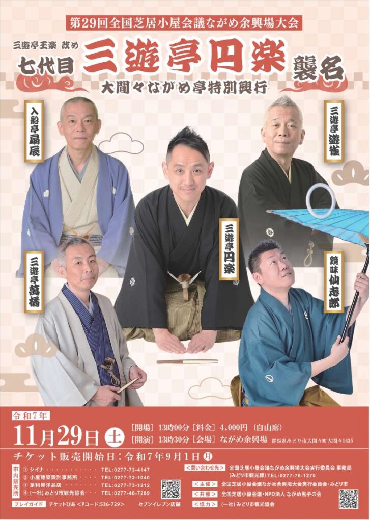 これまで、数多くの落語会の会場として親しまれ、多くの人々の笑いに包まれてきた、ながめ余興場において、全国芝居小屋会議の開催にあわせて「七代目円楽襲名 大間々ながめ亭特別興行」を行います。