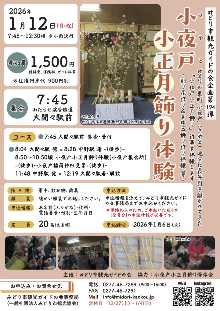 みどり市東町小夜戸地区に、長年引き継がれてきた「小夜戸小正月飾り」行事を体験します。削り花作りやまゆ玉飾り作りを体験できる、年に一度の特別なツアーです。
