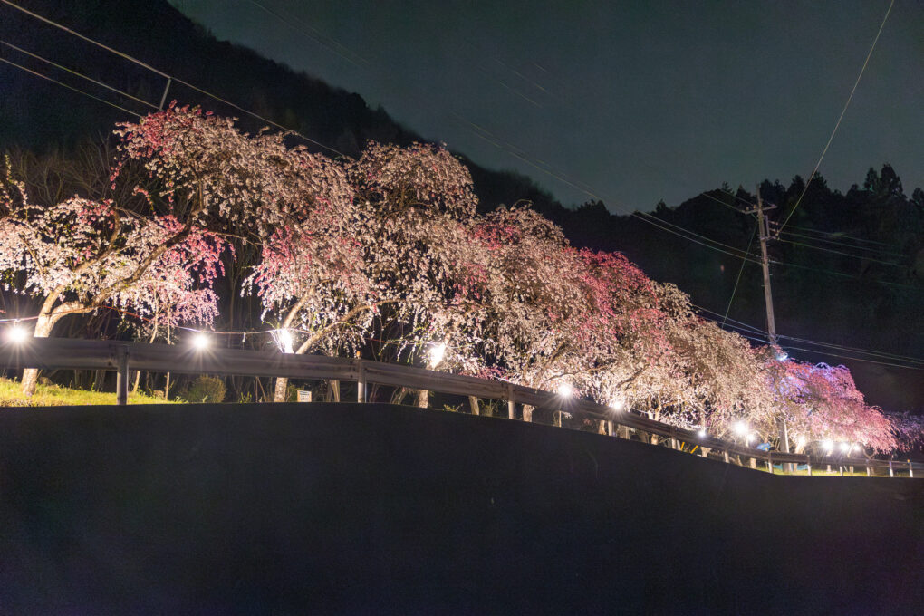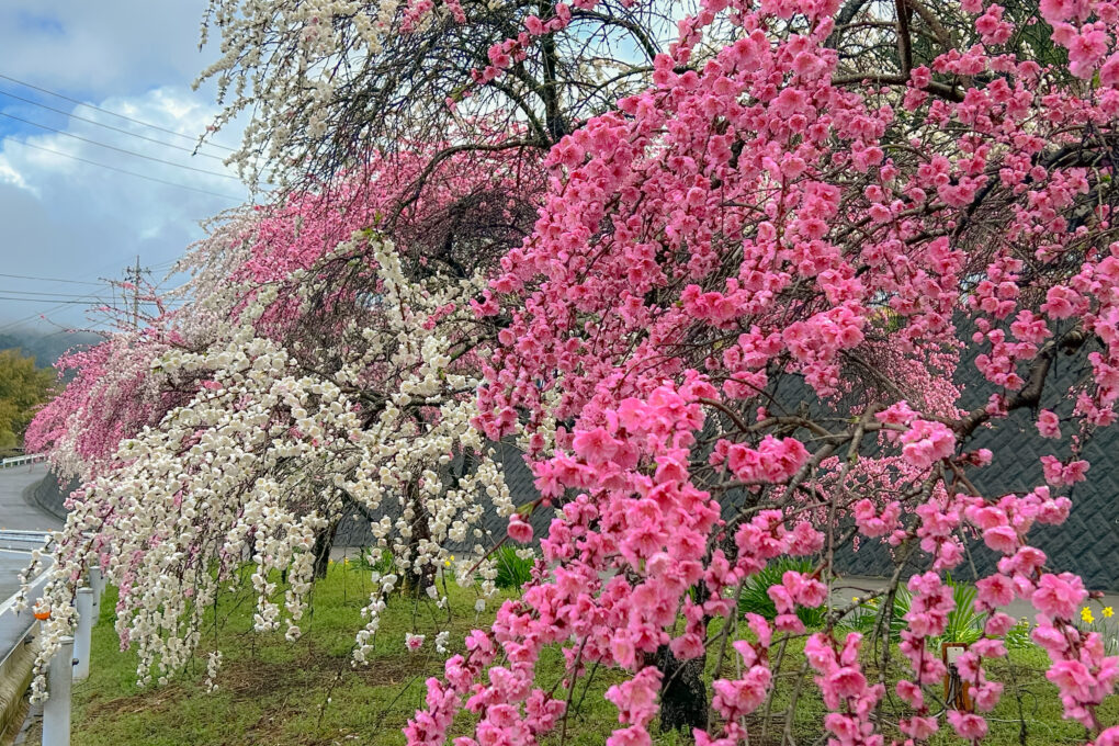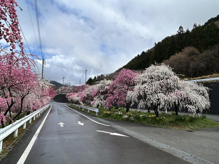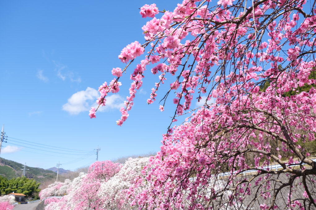 花桃の一種である「しだれ桃」が約2キロメートルにわたって咲く街道です。地元住民の方々が約30年以上前から育ててきたもので、約2,000本以上の花桃が東の山里に咲き乱れます。4月上旬から中旬にかけてお楽みいただけます。