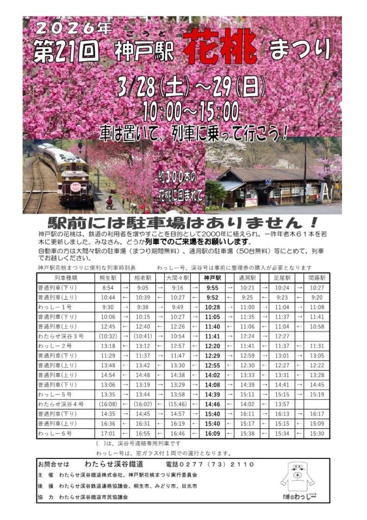 | 備考 | お車でお越しの際は、大間々駅の駐車場(まつり期間無料)、通洞駅の駐車(50台無料)等にとめていただき、列車でお越しください。