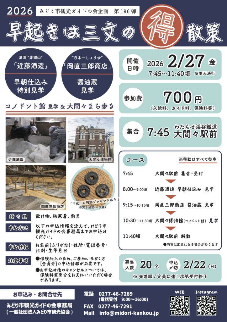 群馬県を代表する清酒“赤城山”の蔵元「近藤酒造」の早朝仕込みの特別見学や岡直三郎商店の醤油蔵見学。普段のまち歩きとは一味違った「大間々散策」です。なかなか体験できないコースとなりますので、この機会にぜひご参加ください。