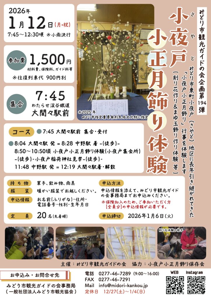 PDFみどり市東町小夜戸地区に、長年引き継がれてきた「小夜戸小正月飾り」行事を体験します。削り花作りやまゆ玉飾り作りを体験できる、年に一度の特別なツアーです。