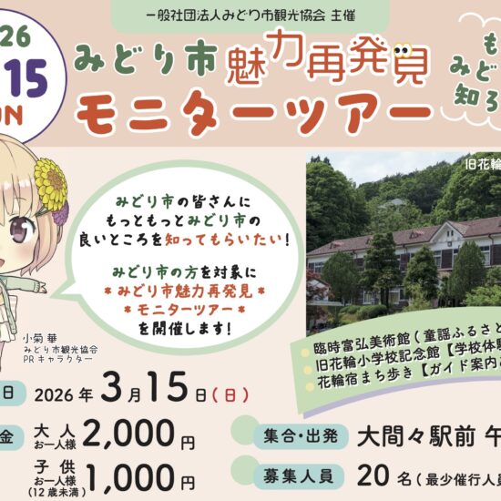 みどり市在住、在勤・在学およびそのご家族の方を対象に、「みどり市魅力再発見!モニターツアー」を開催します。ご参加お待ちしています! ツアー概要 ツアー名 みどり市魅力再発見モニターツアー 旅行日 2026年3月15日(日...