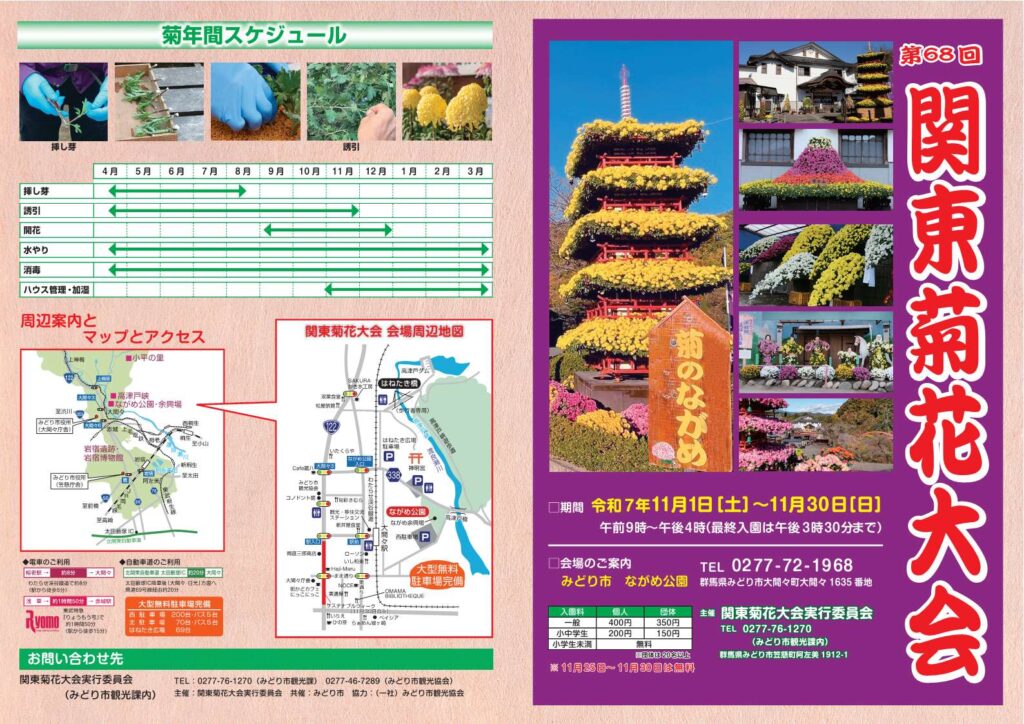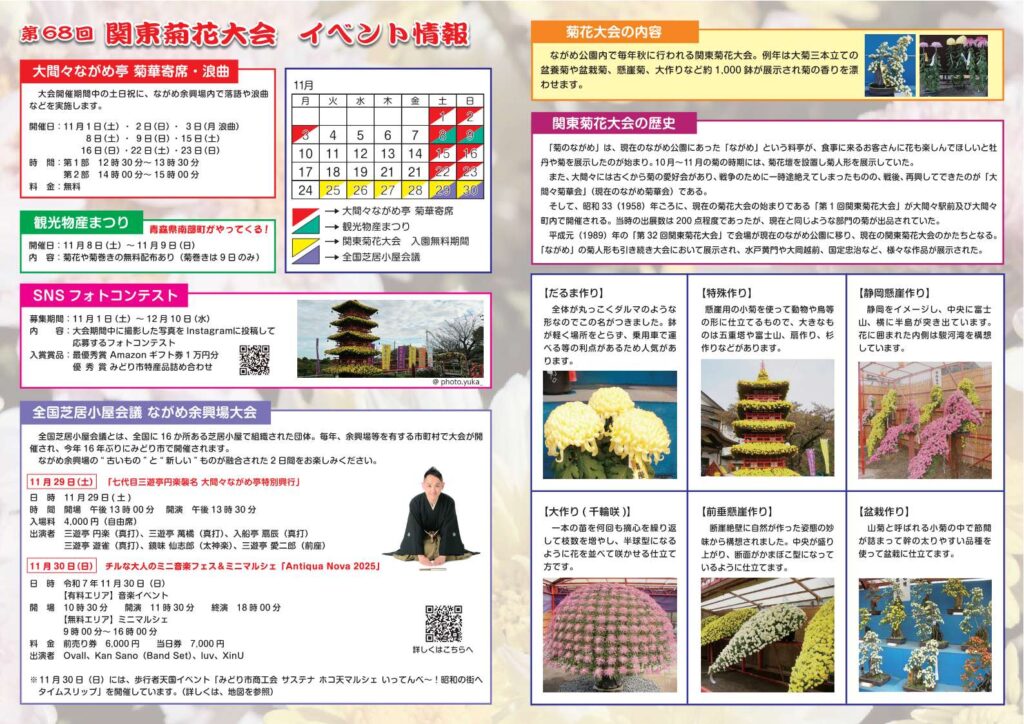 菊花大会開催期間中には、「菊華寄席」や「みどり市観光物産まつり」、「全国芝居小屋会議 ながめ余興場大会」なども開催します。