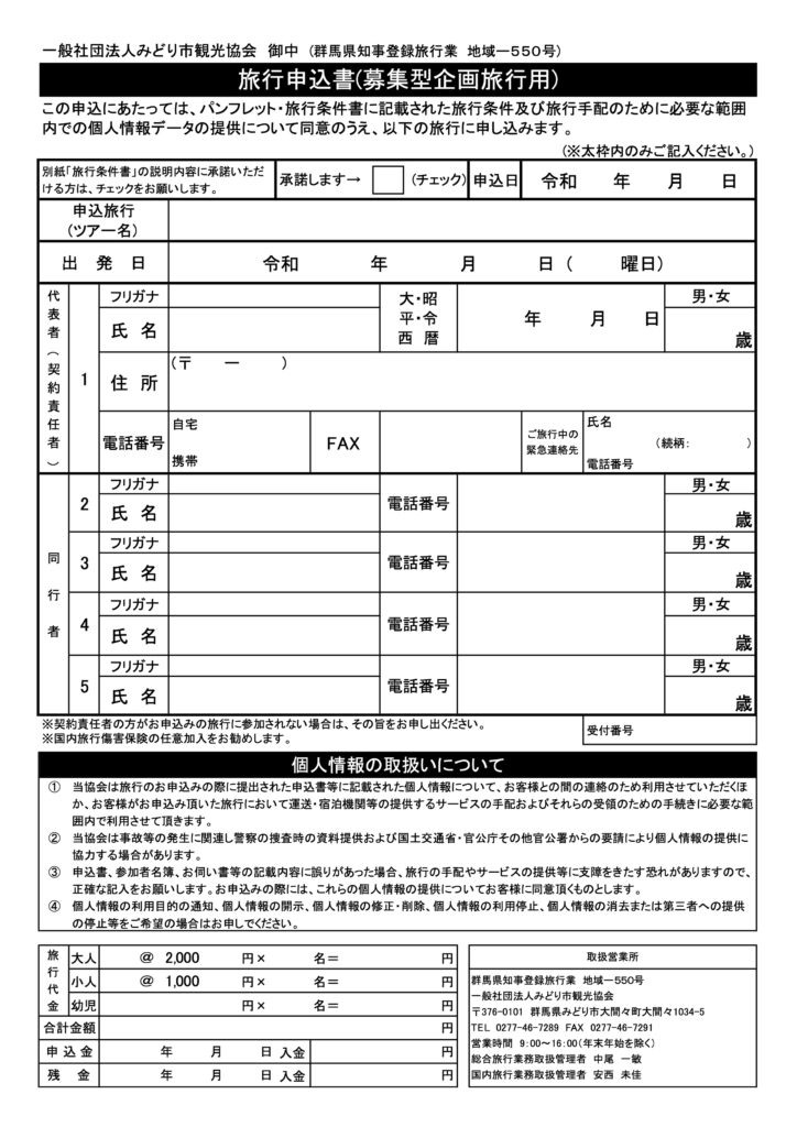 - お申込みから3日以内に、みどり市観光協会にお越しいただき、旅行代金をお支払いください。