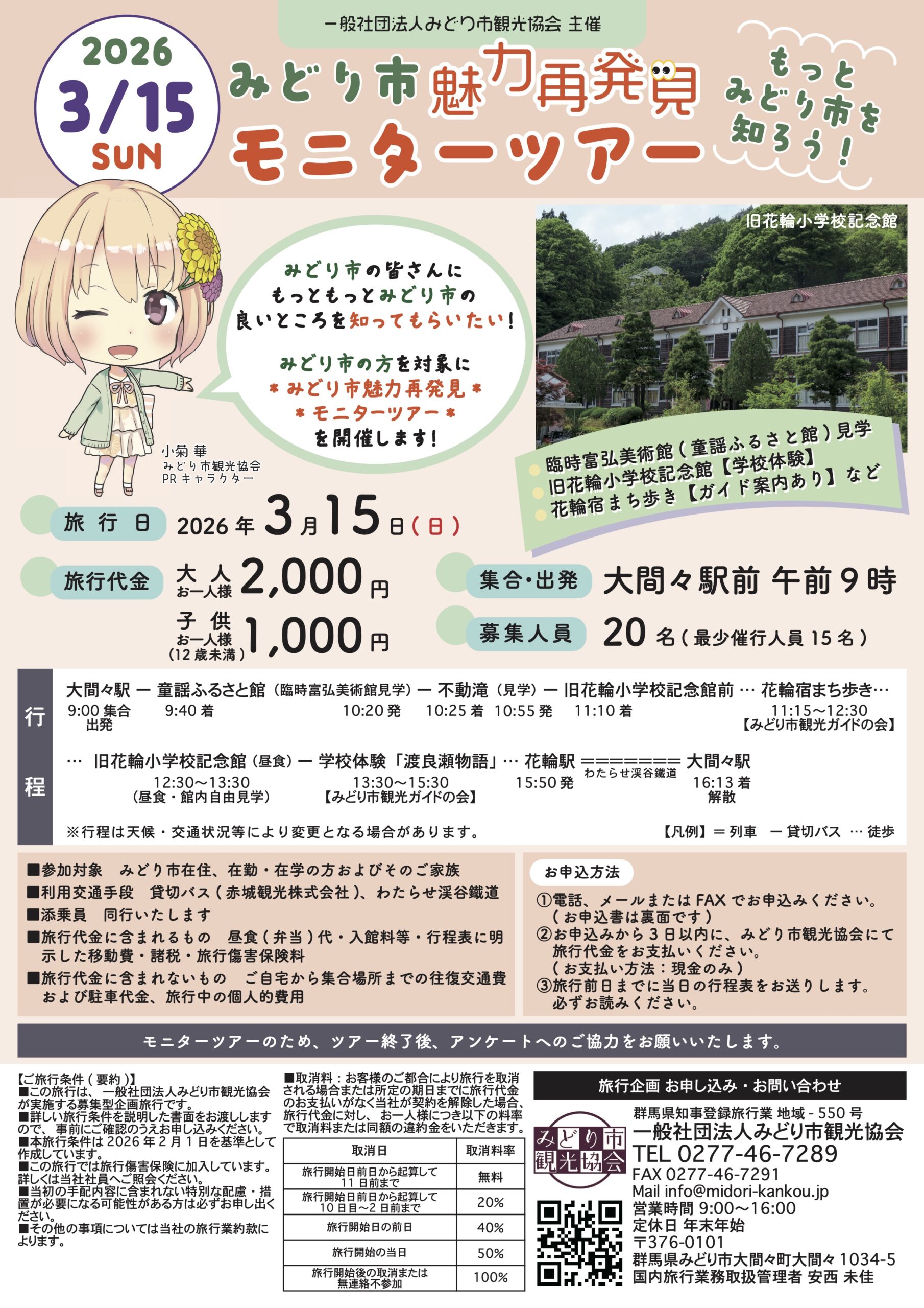 | 行程 | 9:00 大間々駅前集合・出発 |貸切バス(赤城観光) 9:40 童謡ふるさと館(臨時富弘美術館)見学 10:20 童謡ふるさと館出発 |貸切バス(赤城観光) 10:25 不動滝見学 10:55 不動滝出発 |貸切バス(赤城観光) 11:10 旧花輪小学校記念館前到着 |徒歩 11:15〜12:30 花輪宿まち歩き【案内:観光ガイドの会】 |徒歩 12:30〜13:30 旧花輪小学校記念館(昼食・館内自由見学) | 13:30〜15:30 学校体験「渡良瀬物語」【案内:観光ガイドの会】 15:30 旧花輪小学校記念館出発 |徒歩 15:50 花輪駅発 |わたらせ渓谷鐵道 14:13 大間々駅着・解散 ※天候・交通状況等により変更となる場合があります。 |