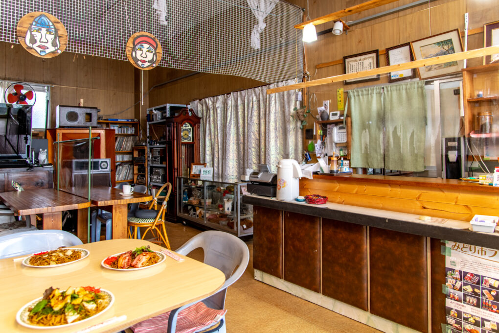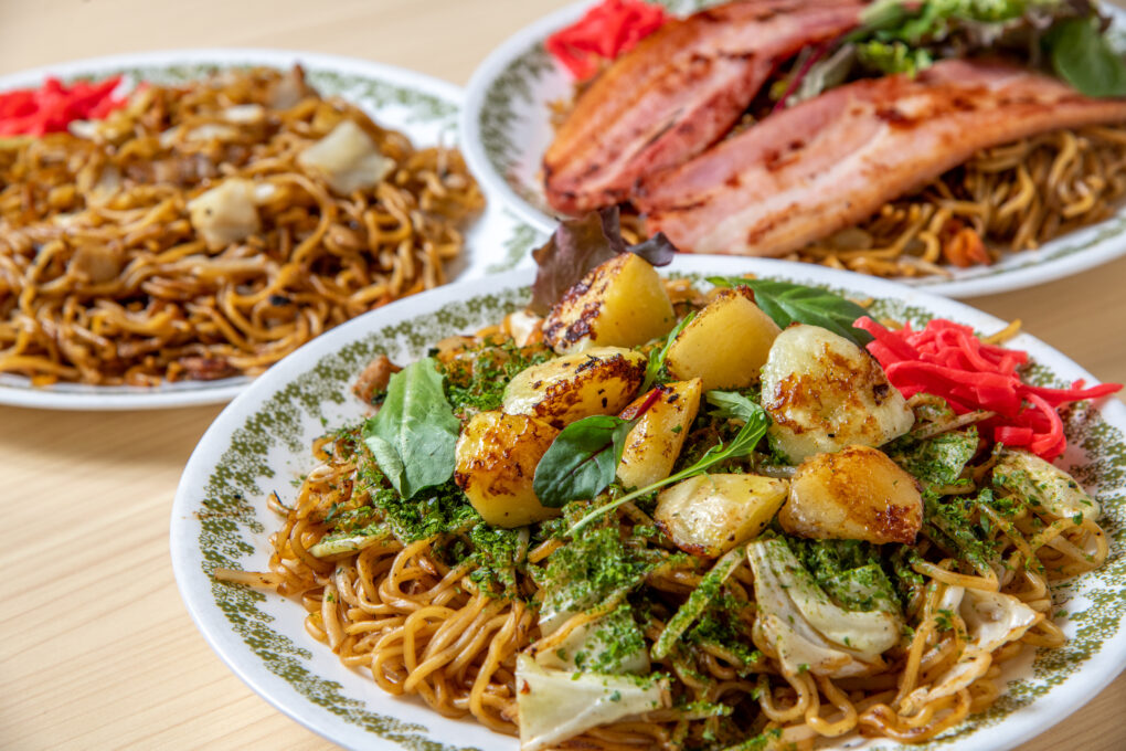 名物の黒胡椒焼きそばが人気のお店。焼きそばは黒胡椒のほかにも、シンプルなソース焼きそばやポテト入り、コーン入りなどトッピングも種類が豊富で、様々な組み合わせに対応しています。もつ煮やソフトクリームなどのメニューもあり、落ち着いた店内でゆったりと楽しむことができます。