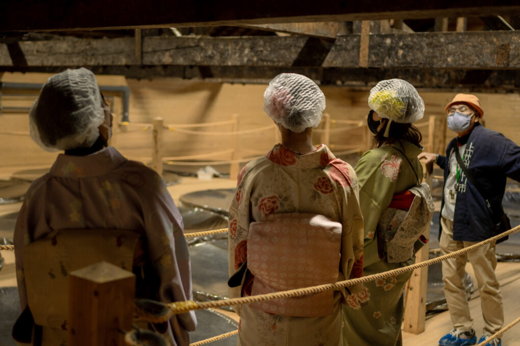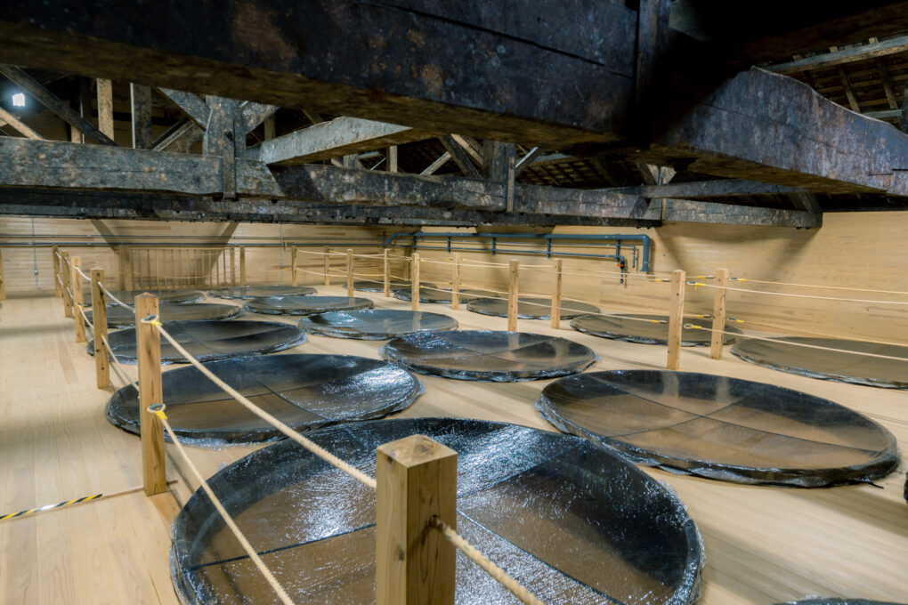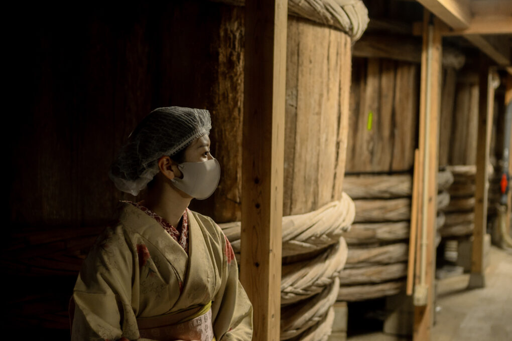 岡直三郎商店では、創業当初から変わらない大きな木桶を使い醤油を作り続けています。仕込みを行っている蔵の見学を随時受付しています。見学は無料で、団体の場合は事前に予約が必要となります。