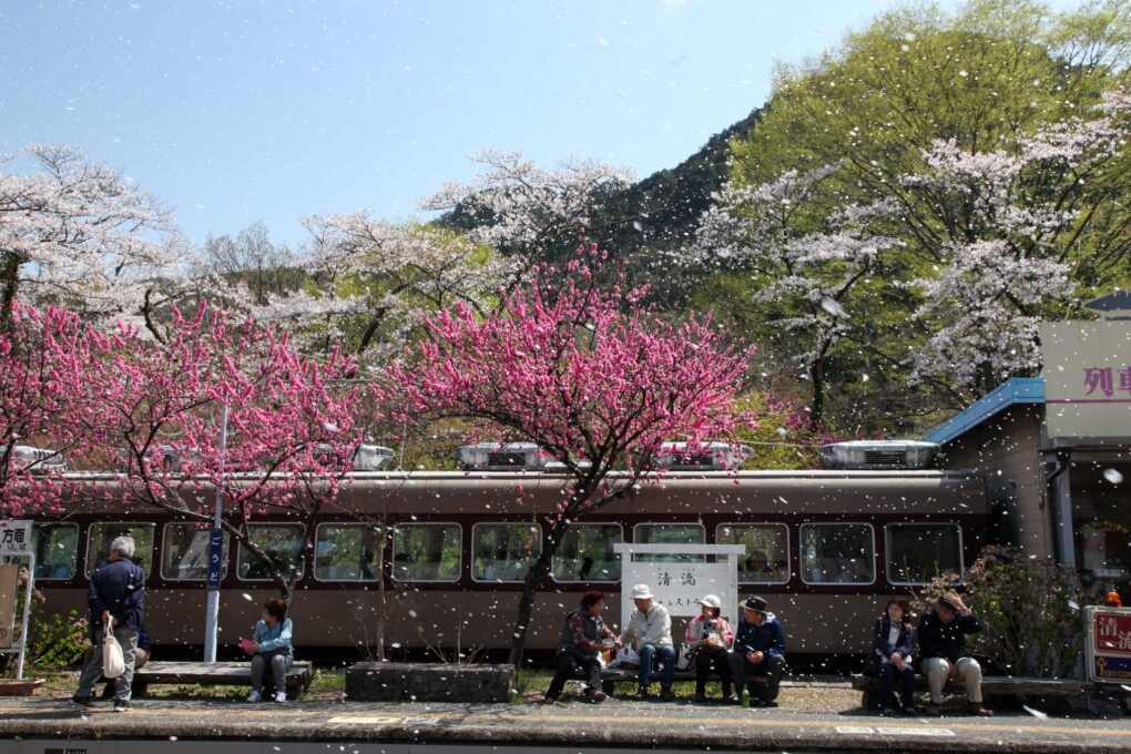 わたらせ渓谷鐵道の神戸(ごうど)駅は、構内に植えられた約300本の花桃が開花する沿線屈指の人気スポット。時期が合えば花桃と桜と列車の競演も。構内には列車のレストラン「清流」があり、やまと豚弁当やトロッコ弁当といった駅弁が購入可能。駅舎やプラットホームは有形文化財として登録されていて、足尾鉄道開業当初からの歴史を見守ってきた数少ない駅舎。