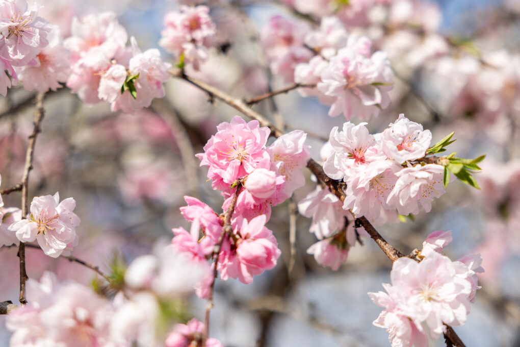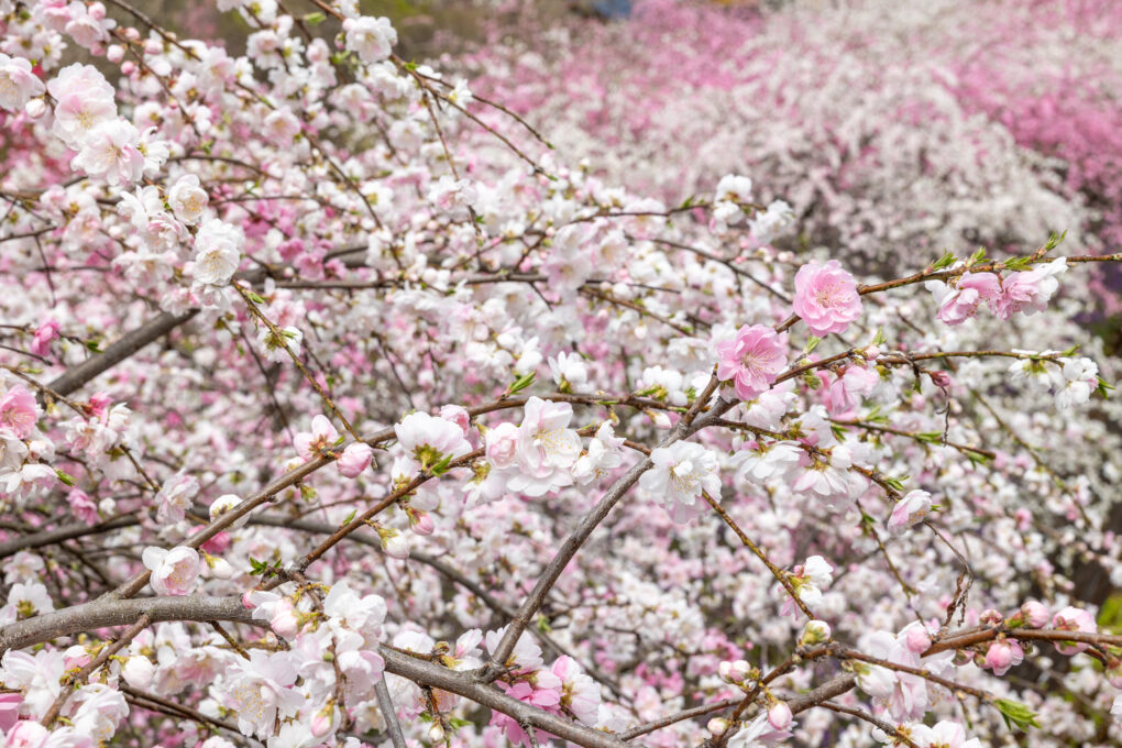 1本の木に咲くしだれ桃は、白と桃色のどちらか一色だけですが、なかには両方の色が混ざって咲く木もあります。