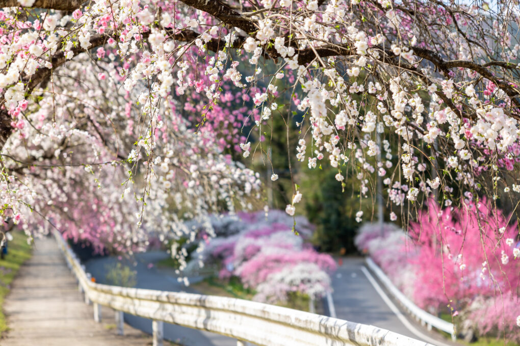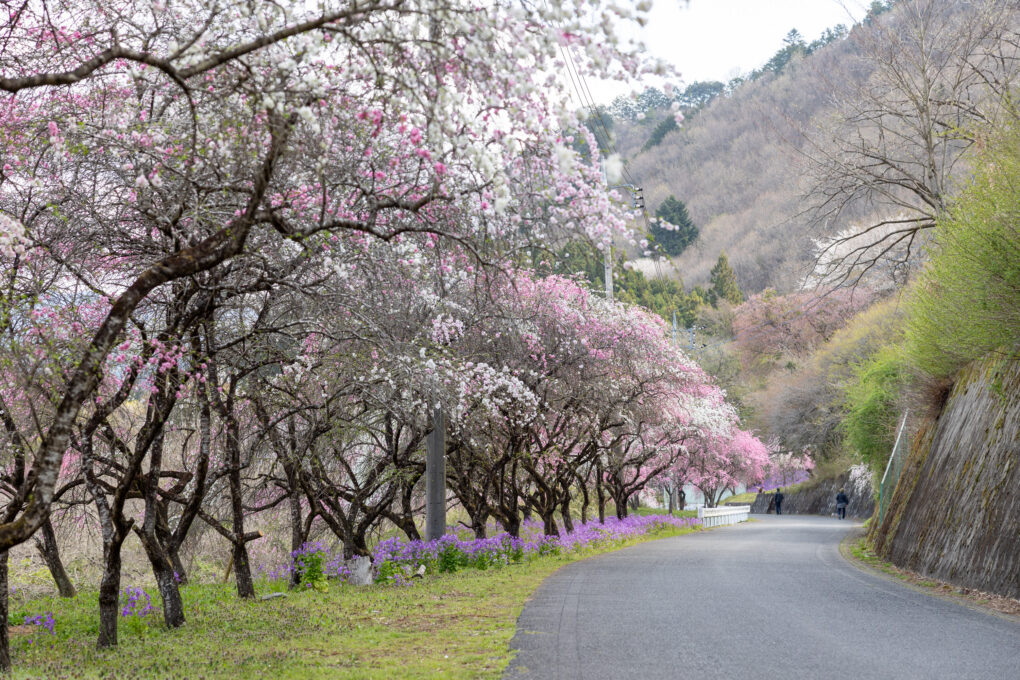 花桃の一種である「しだれ桃」が約2㎞の間に2,000本以上並ぶ街道。地元の人々が育ててきたもので、4月上旬から中旬にかけて楽しめます。