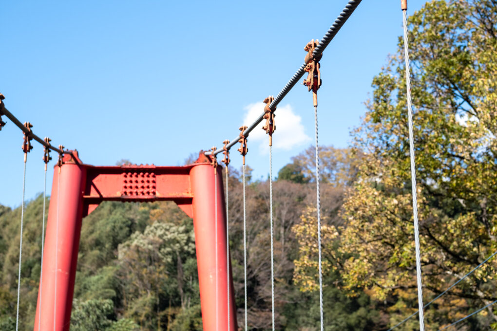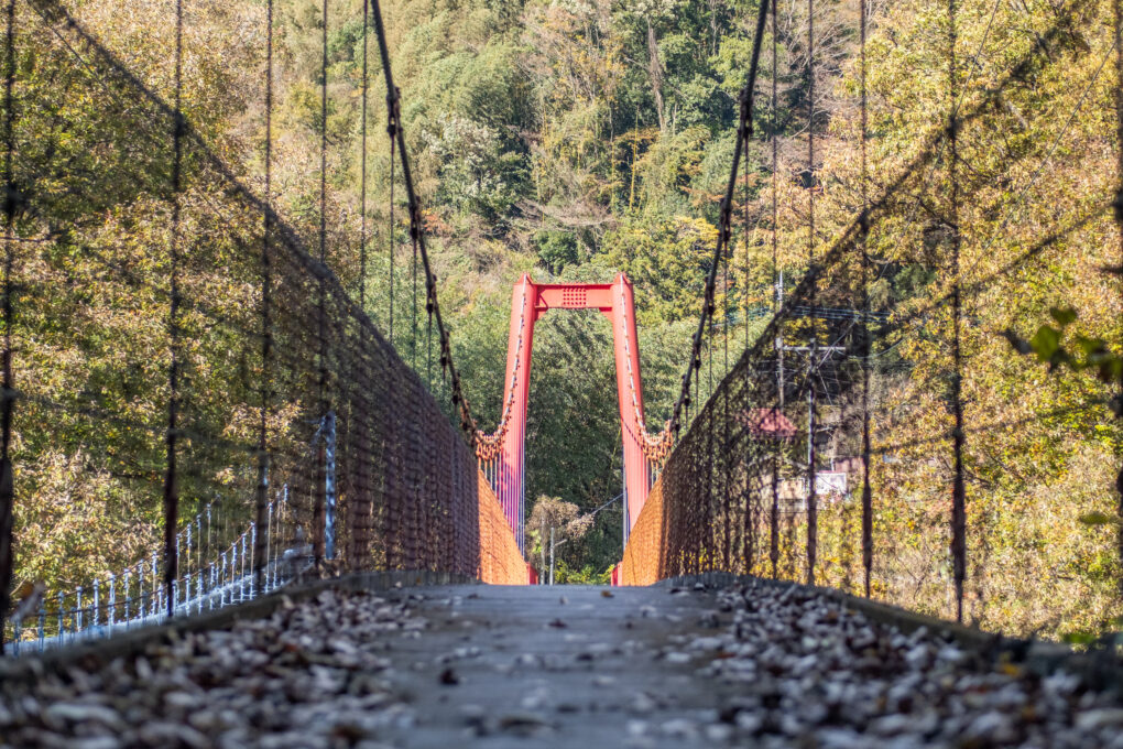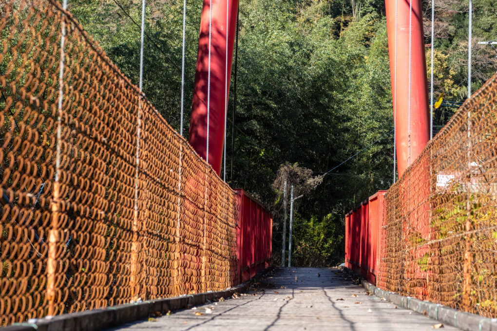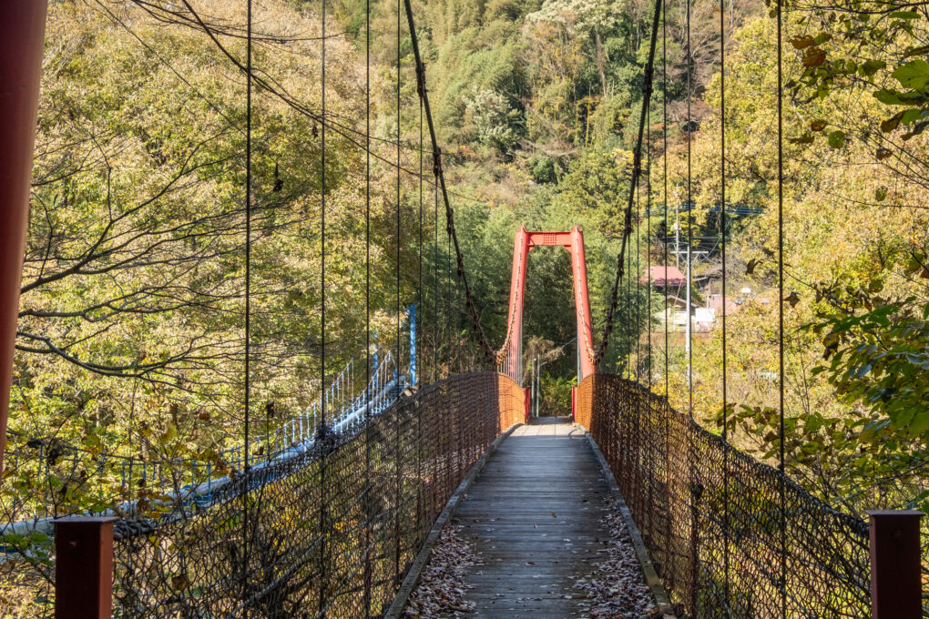 わたらせ渓谷鐵道小中駅の裏手にひっそりと架かる下松島橋は、スリル満点のつり橋です。橋板の隙間からは下の川が見え、進むたびに板がミシミシと鳴る様子は、怯えながら渡る人を笑っているかのよう。