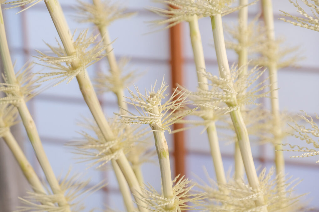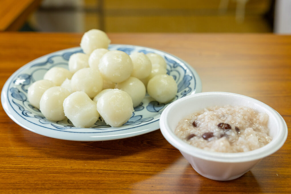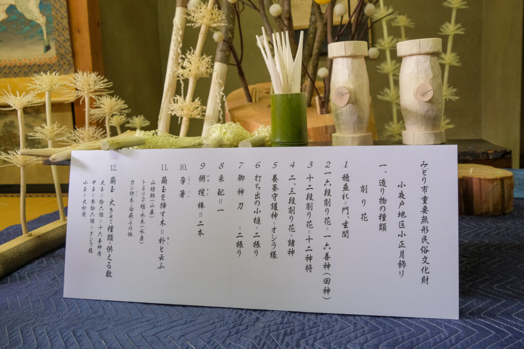 市の重要無形民俗文化財に指定されている、小夜戸(さやど)の小正月飾り。削り花や打ち出の小槌といった縁起物を飾り付け、五穀豊穣や子孫繁栄を願います。この地区にはかつて養蚕農家が多かったことから、繭玉の飾り付けを米粉で作るなど、蚕にまつわるものも。現在では家庭で行われることも少なくなったため、保存会が中心となって次の世代へと語り継いでいます。