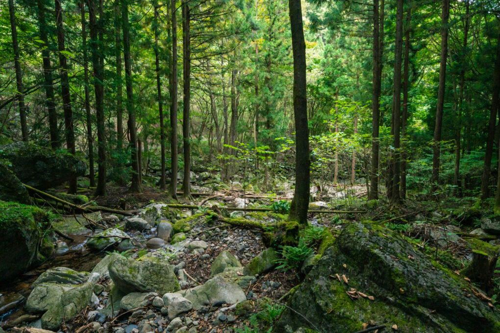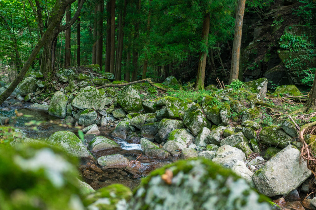 ゴツゴツとした巨石の間を流れ落ちる落差10mほどの滝。袈裟丸山の塔ノ沢登山口近くのこの滝は、小ぶりながらも透明度の高い水で、細くも力強く趣があります。滝を見るには石を伝って川を渡る必要があるため、足元にはくれぐれもお気を付けください。
