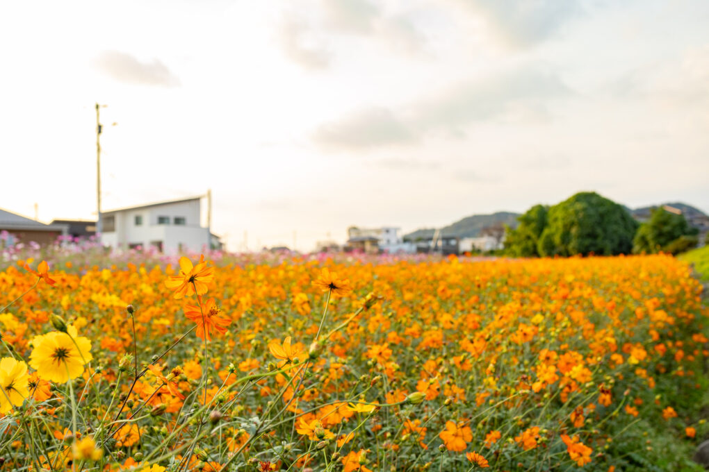 秋に咲くお花として代表的なコスモス。笠懸町鹿にあるコスモス畑では、約600平方メートルの敷地に「鹿の川田んぼ花の会」の方々が植えたコスモスとキバナコスモスが咲き、澄んだ秋の空とコスモスの競演を楽しむことができます。