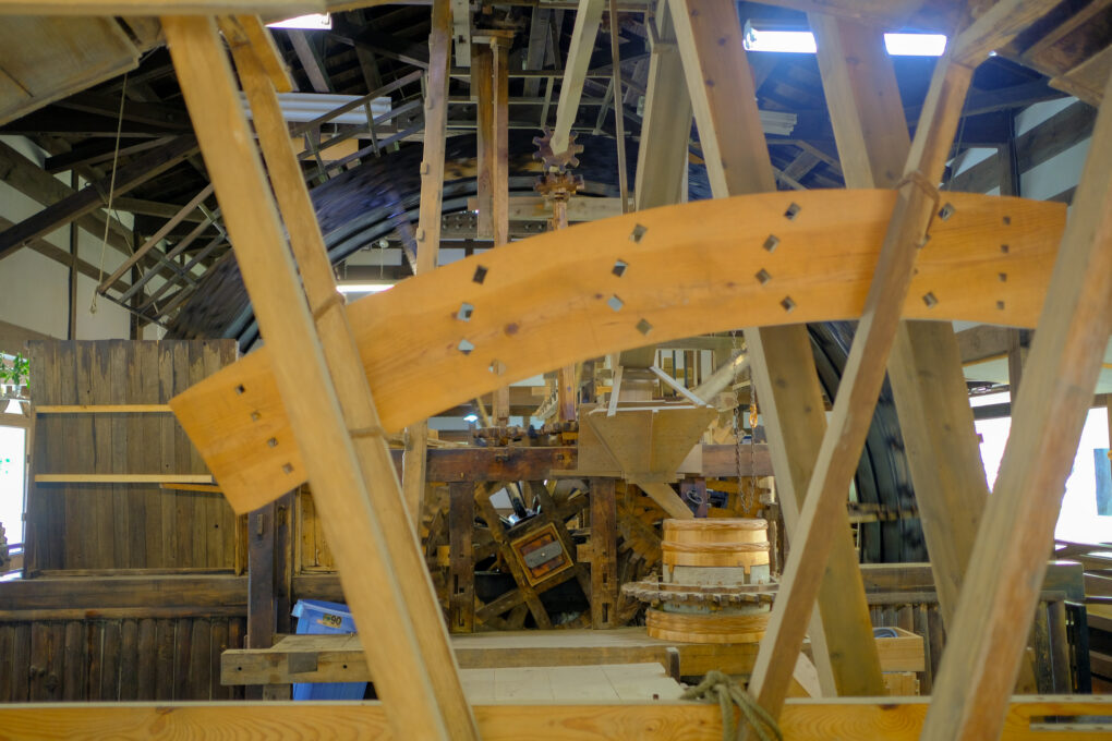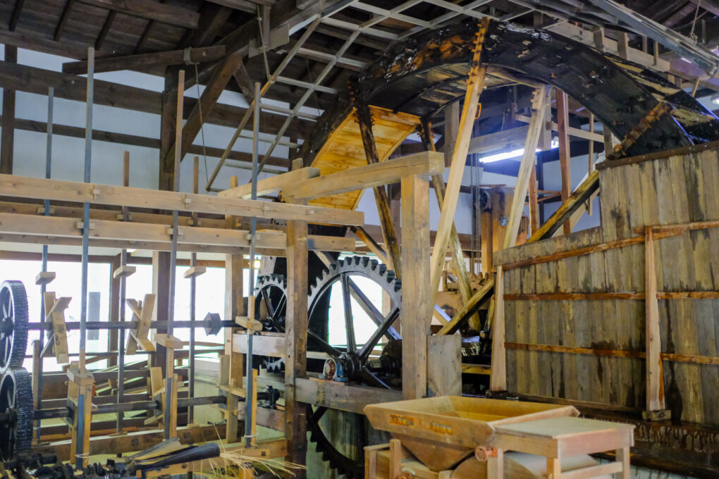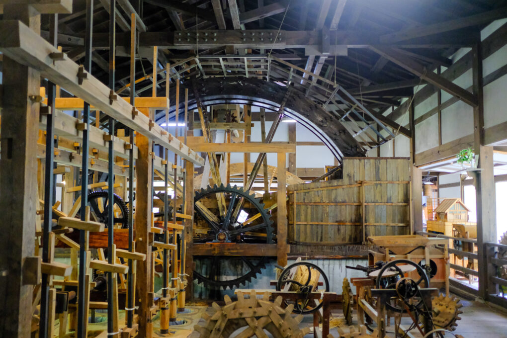 小平の里親水公園内、野口水車保存館には明治から昭和にかけて精米や製粉の動力として稼働していた水車が保存されています。これは、大間々町の野口商店が建造し、1990年に町に寄贈、大間々町在住のからくり職人である刈部文作が復元した後、野口水車保存館へ移設されました。野口水車は日本国内における屋内型最大級の水車であり、水輪の直径は5.64m、幅0.8mにもなります。