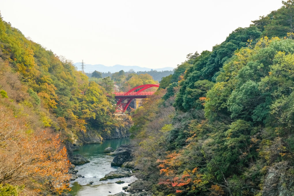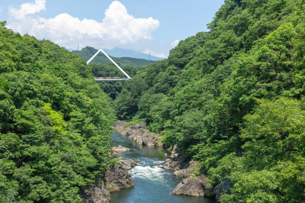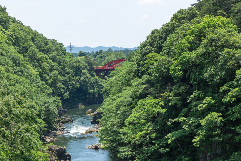 渡良瀬川中流、新緑や紅葉と四季折々の美しい景色を楽しめる、みどり市屈指の人気スポット。「関東の耶馬渓」とも讃えられます。はねたき橋から高津戸橋までは約500mの遊歩道があり、雄大な渓谷美やゴリラ岩など、ここでしか見れられない景色を楽しめます。大間々駅から徒歩約8分。
