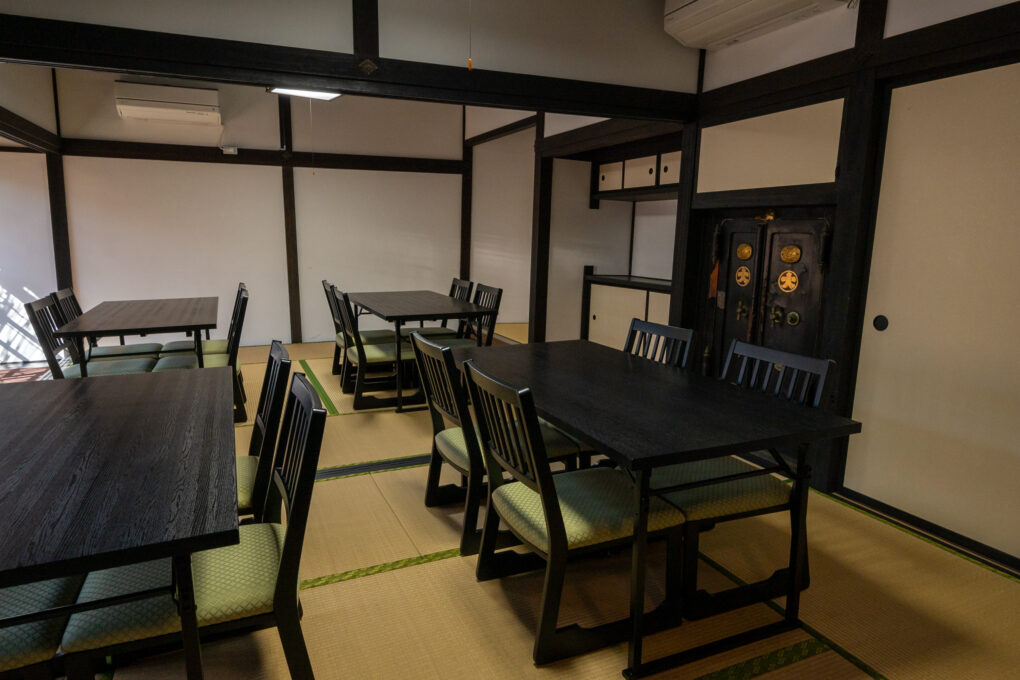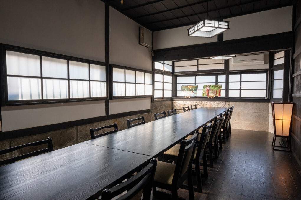 建物は、約100年前に建築された旧酒造店舗(旧奥村酒造)の建物をリノベーションしたもの。柱や間仕切り、石積みの壁は当時のまま、灯籠や酒蔵で使われていた金庫も残っています。